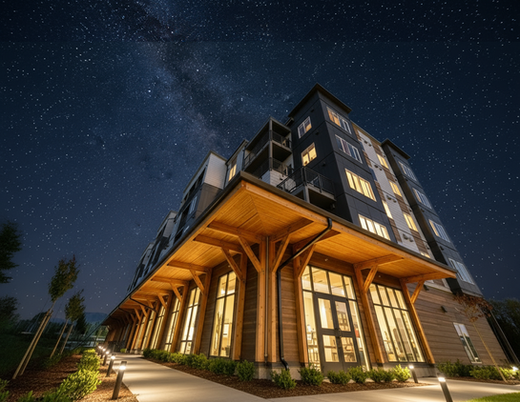 SCR designed a structure with approximately 76 residential units above 8,400 square feet of ground-floor retail and parking for 127 vehicles. To visually distinguish the commercial level, the design introduces a continuous wood canopy and column façade that frames the storefronts and defines a sheltered pedestrian walkway, inviting activity and reinforcing the site’s Northwest character.
